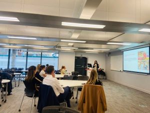 Investigadora Báltica Cabieses presentando centro de investigación a profesores, estudiantes y autoridades de Teesside University.