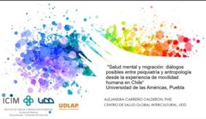 El día miércoles 19 de abril la investigadora del Centro de Salud Global Intercultural Alejandra Carreño dictó una clase para el Doctorado Universidad las Américas de Puebla sobre “Salud mental y migración: diálogos posibles entre psiquiatría y antropología desde la experiencia de movilidad humana en Chile”. Participaron 15 estudiantes de la clase que fue en modalidad virtual.